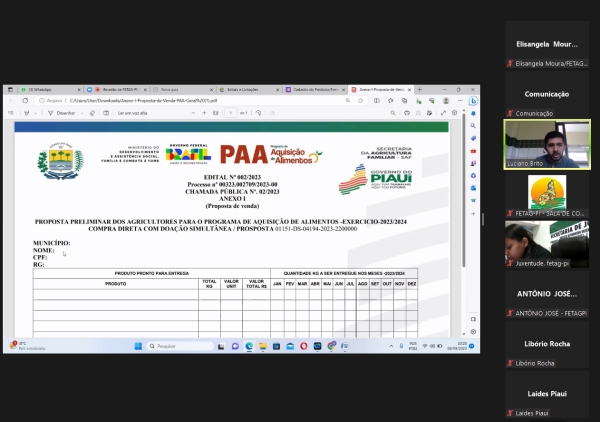 A Diretoria da FETAG-PI, promoveu importante reunião virtual na manhã de hoje (8/9), juntamente com a Secretaria de Agricultura Familiar do Estado (SAF).